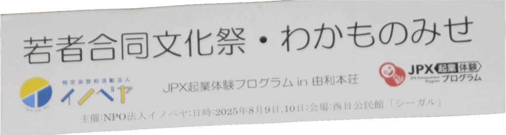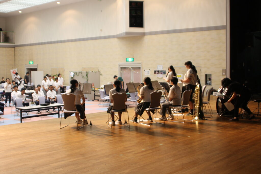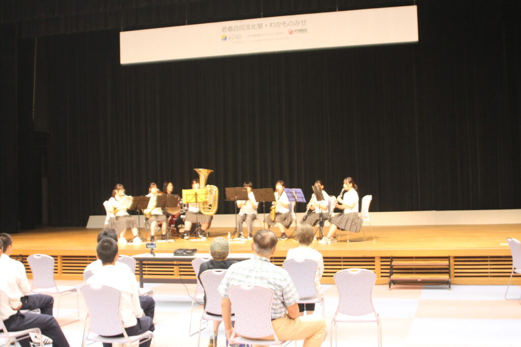 令和7年8月9日、西目公民館「シーガル」講堂で開かれた「若者合同文化祭・わかものみせ」の幕開けは、西目高校吹奏楽部の演奏から始まりました。