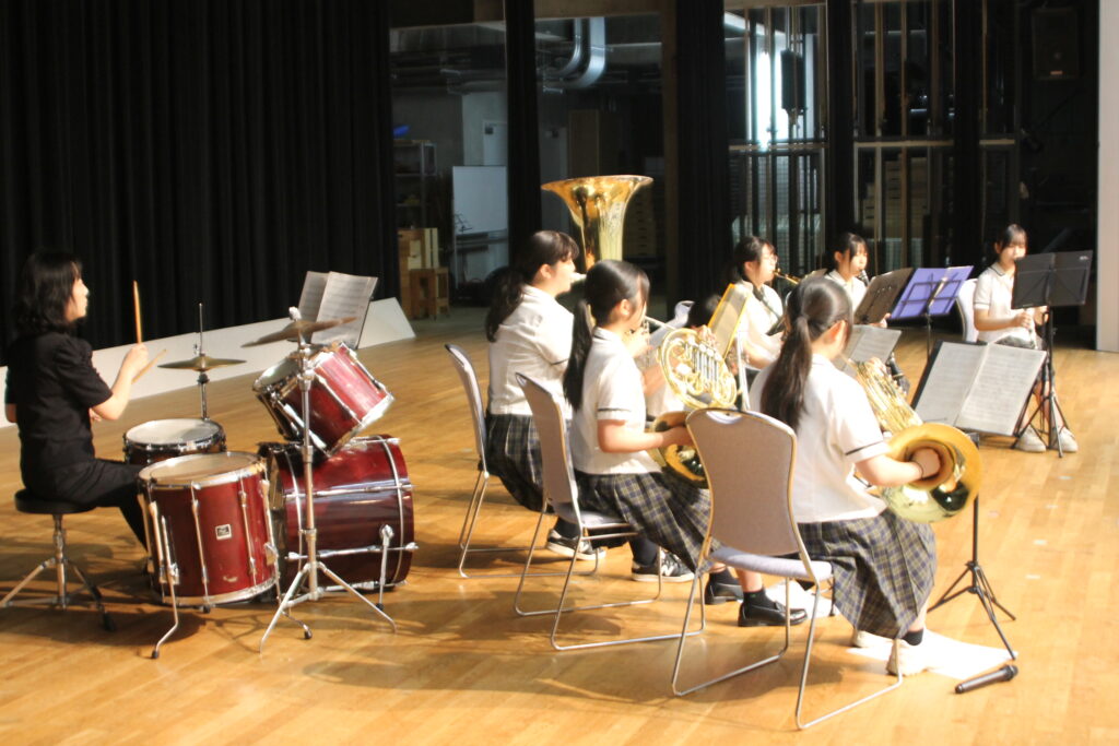 写真には、ステージ上で真剣な表情で楽器を奏でる生徒たちの姿が写し出されています。ドラム・金管・木管が揃った小編成ながら、ホール全体に響く力強さと、若さあふれるフレッシュな演奏が印象的でした。