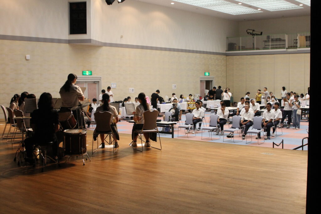 客席には、出店準備を終えた高校生や、保護者、地域の方々が座り、演奏に耳を傾けています。ステージを見つめる観客の表情からも、音楽に包まれるひとときが会場全体を和やかにしたことが伝わってきます。