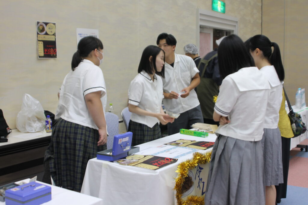 写真には、制服姿で真剣にレジ対応をする生徒や、笑顔で接客する姿が収められています。限られた時間でお客さんをさばきながらも、仲間と協力し合うチームワークが際立っていました。