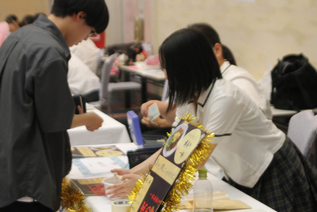 また、ステージ上で堂々と会社名を掲げ、拳を突き上げる集合写真からは、挑戦への誇りと達成感が伝わってきます。単なる模擬店舗にとどまらず、「一杯600円に込めた価値」を地域の人々にしっかり届けたことが感じられるシーンでした。