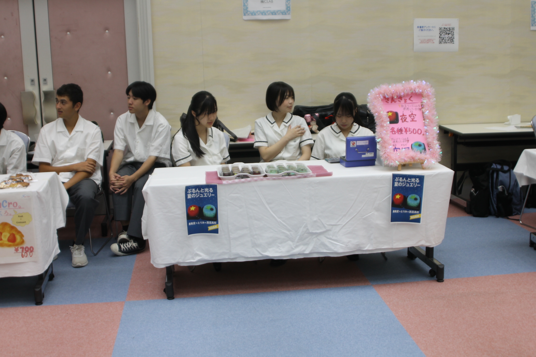 写真には、ブースに並んで真剣に販売にあたる生徒たちの様子が収められています。商品を前にして接客する姿や、仲間とアイコンタクトを取りながら運営を進める姿から、模擬株式会社の実践的な空気が伝わってきます。